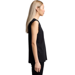 - Sleeveless tank, raw armhole edges, neck ribbing, double needle hems